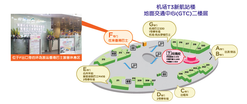 - 旅客可于下机后步行约10分钟前往机场T3新航站楼地面交通中心(GTC)二楼,通过A或B号门,即会见到问询处;问询处设有多个过境巴士票务柜台,而中国华通为其一(柜台编号:C-205),为乘客提供售票及票务查询。
